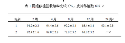 3. Observation method and result evaluation: The wound was observed at 2.4, 8 and 12 weeks after surgery, and the color, hardness and elasticity were observed. The survival rate of skin grafting was measured with a wound measuring scale [8], and the intersection of skin graft area and original area was measured at 4, 8, 12, 24, and 48 weeks after injury, and the skin shrinkage rate and other values were calculated, and the t-test analysis of variance was statistically treated.